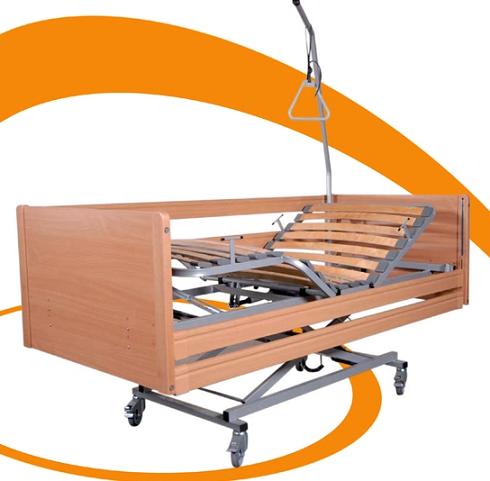 Łóżko rehabilitacyjne elektryczne PB 526 charakteryzuje się nowoczesną konstrukcją leża i podnośnika, która wraz z ciekawie zestawioną kolorystyką metalu i drewna w kolorze buku, tworzy eleganckie łóżko pielęgnacyjne. Powierzchnia leża wypełniona jest listwami sprężynującymi. Leże podzielone jest na 4 segmenty i posiada 2 pojedyncze silniki sterowane indywidualnie, a ponadto regulowany segment podudzia poprzez mechanizmy zapadkowe. W standardowym wykonaniu leże ma wymiary 90 x 200 cm. Ze względów wytrzymałościowych leża o szerokości powyżej 100 cm są wypełniane siatką metalową.