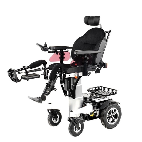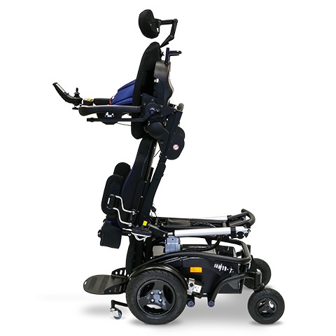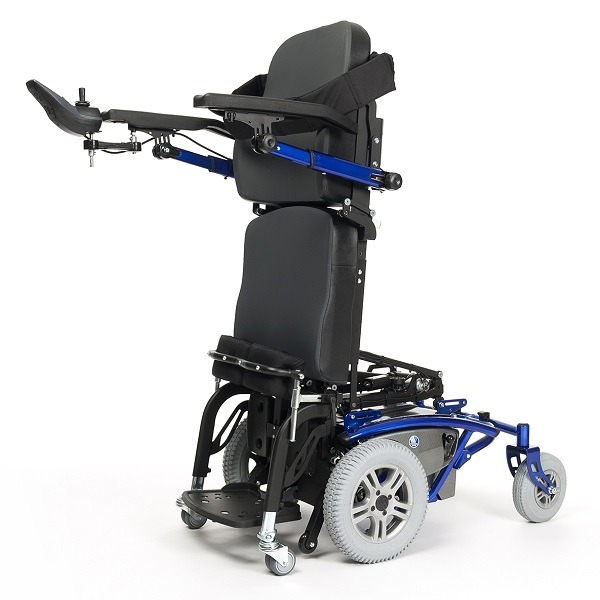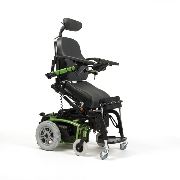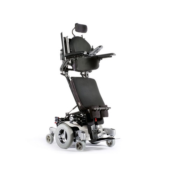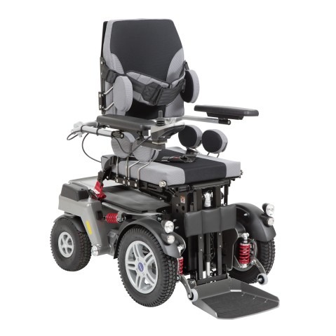 Wózek inwalidzki elektryczny Timix SU z napędem elektrycznym na przednie koła, terenowy, z funkcją pionizacji. Szeroki pas piersiowy plus stabilizacja kolan umożliwia trwanie w pozycji wyprostowanej.